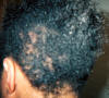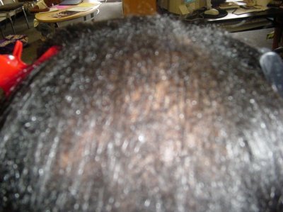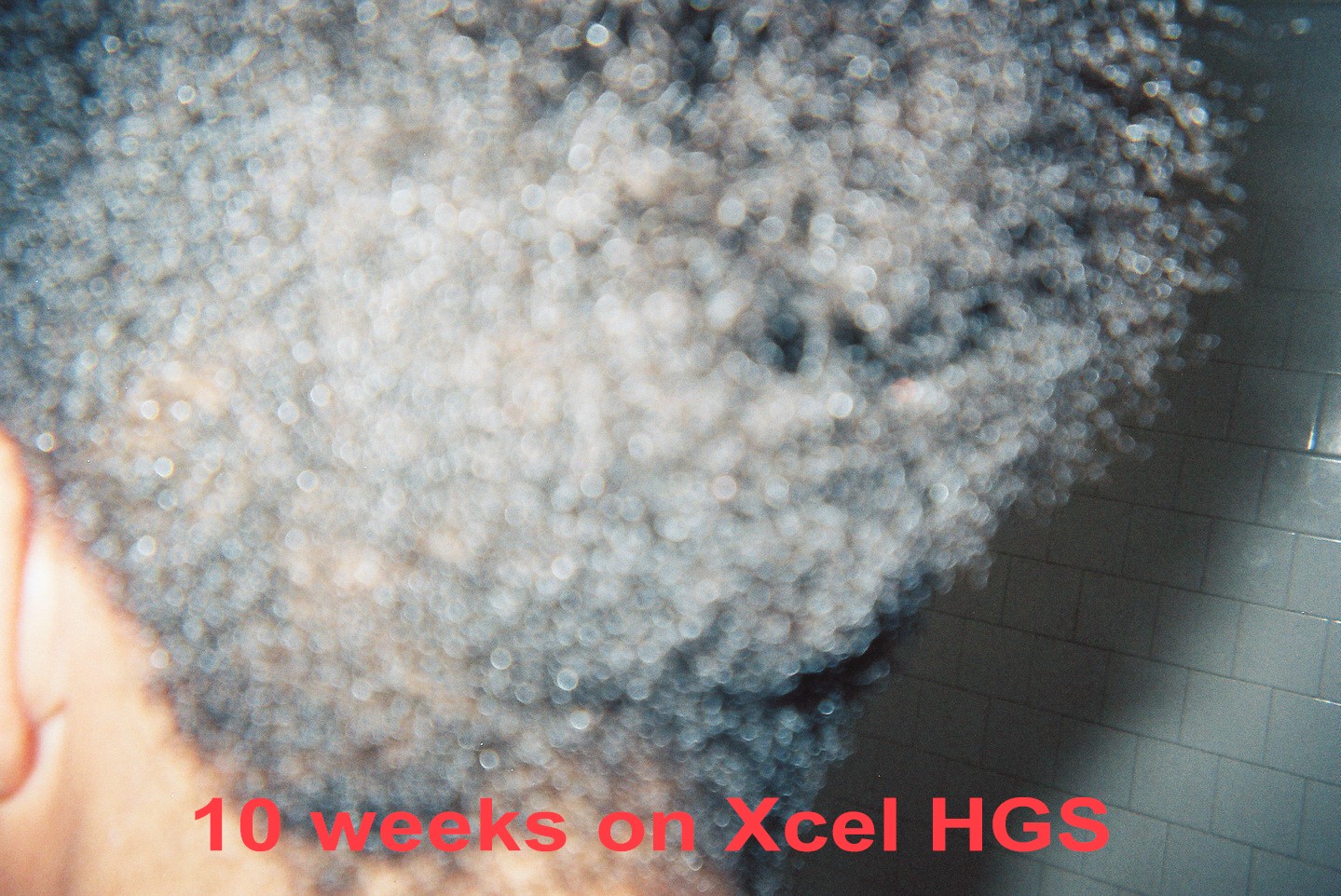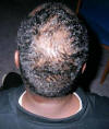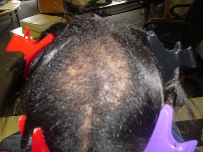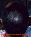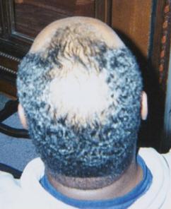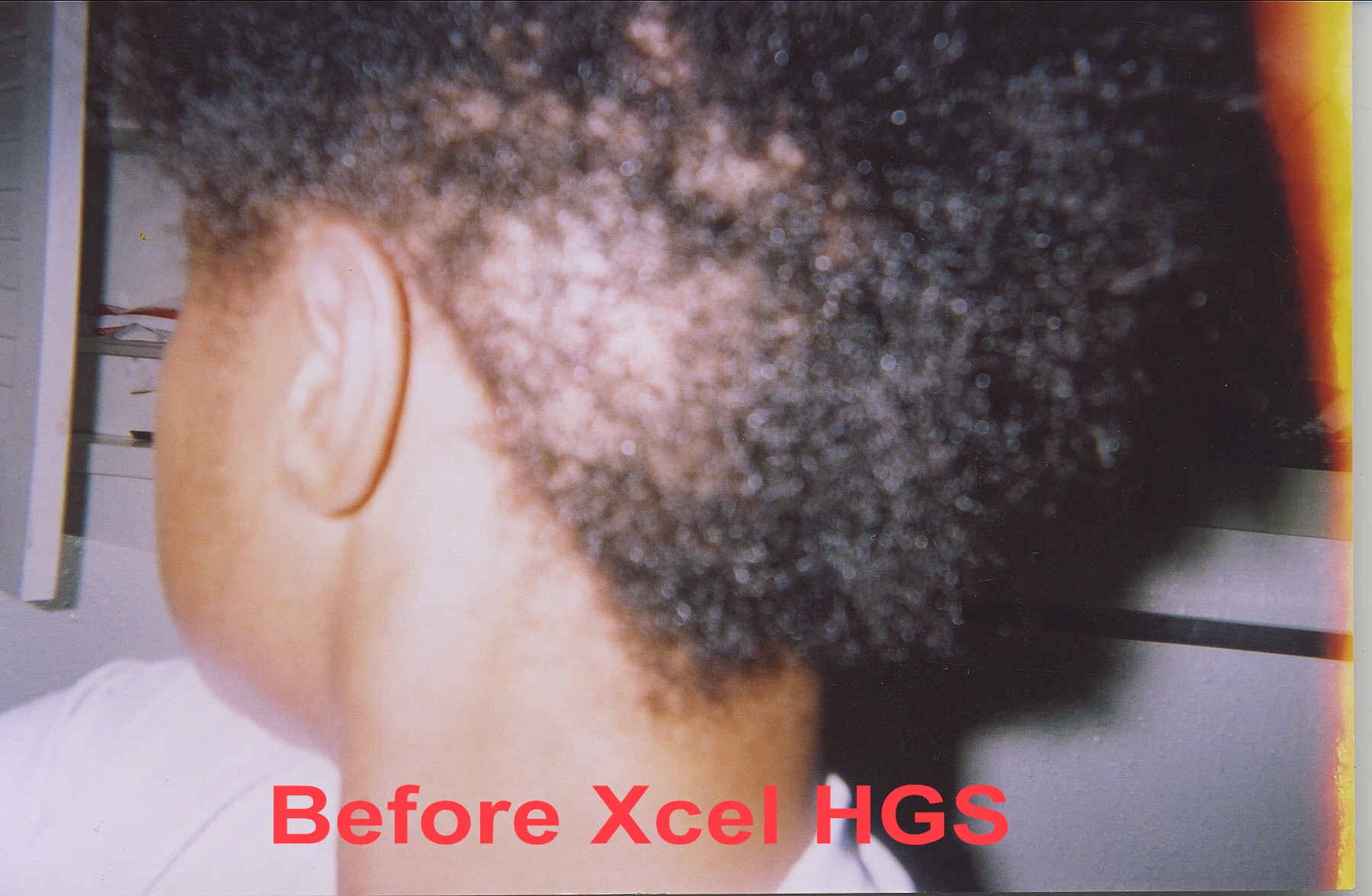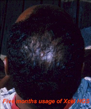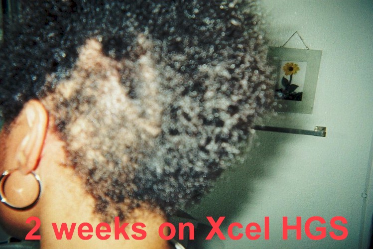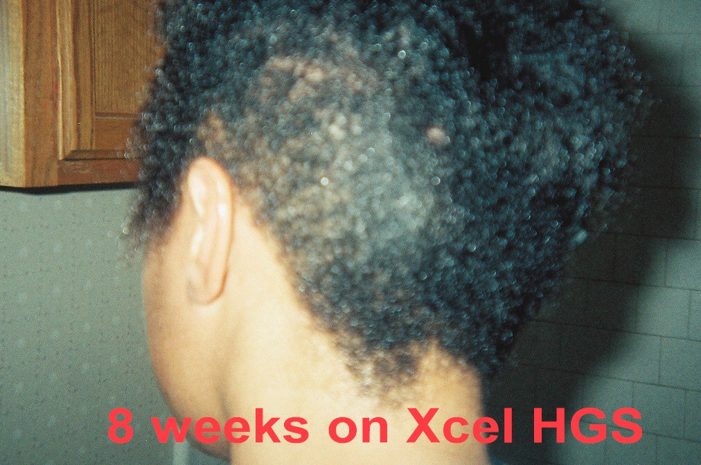A middle aged woman frequently visits her beautician to have hair weaves to cover up badly damaged hair and scalp due to years of chemical treatments with harsh perm products. The use of so many chemical treatments caused her to develop a severe fungus throughout her scalp. She had been using prescribed fungal medications with only moderate results. Furthermore, the use of these drugs did not help facilitate the growth of new hair. She agreed to evaluate the effect of Xcel Nutraceuticals HGS to treat her fungal problem and to see if the product would assist the growth of new hair. She was advised to use the Xcel HGS twice a day and to report back to the beautician every two weeks to examine her scalp and to count the number of hair strands in the affected areas of her scalp. The pictures to the left illustrate the results.