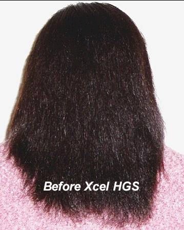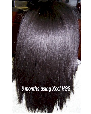 A middle age woman was concerned that her hair was not healthy and had numerous split ends. She also complained of constant shedding every week after combing. She decided to use Xcel HGS to see if split ends could be reduced and end constant hair shedding. After six months she reported very little loss of hair and even more so significant new growth resulting in longer hair. The pictures illustrate the results from her use of Xcel HGS.
