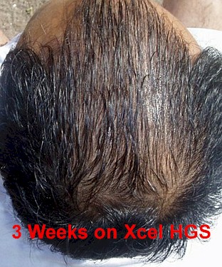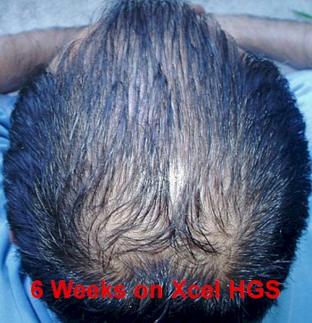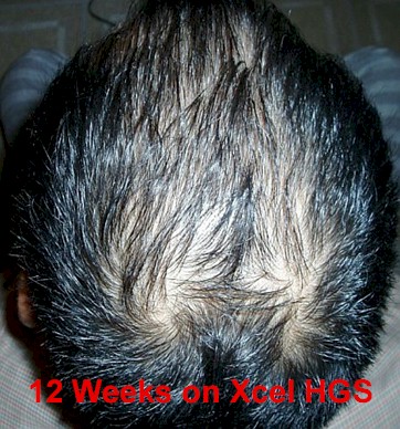 A 44 year old male had been experiencing a steady loss of hair density on the crown and in the back of his head for the past few years. The onset of his hair loss may very well be contributed to age factors such as DHT accumulation in scalp and nutritional deficiencies. He started using Xcel Nutraceuticals HGS twice a day for three months. The pictures to the left illustrate the results.