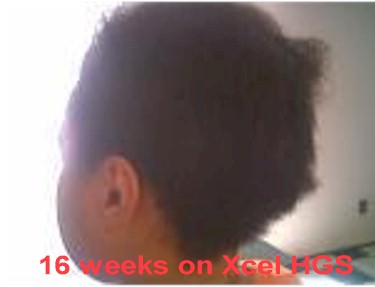 A 27 year old woman had significant hair loss behind the left ear three years ago after getting her hair perm. The woman was also attending college and indicated that stress may have been another contributing factor to hair loss. Taking in all factors, hair follicles apparently were so extensively damaged that very few hair strands had grown in this area since then. She started using Xcel Nutraceuticals HGS every day for four consecutive months. The pictures to the left illustrate the results.